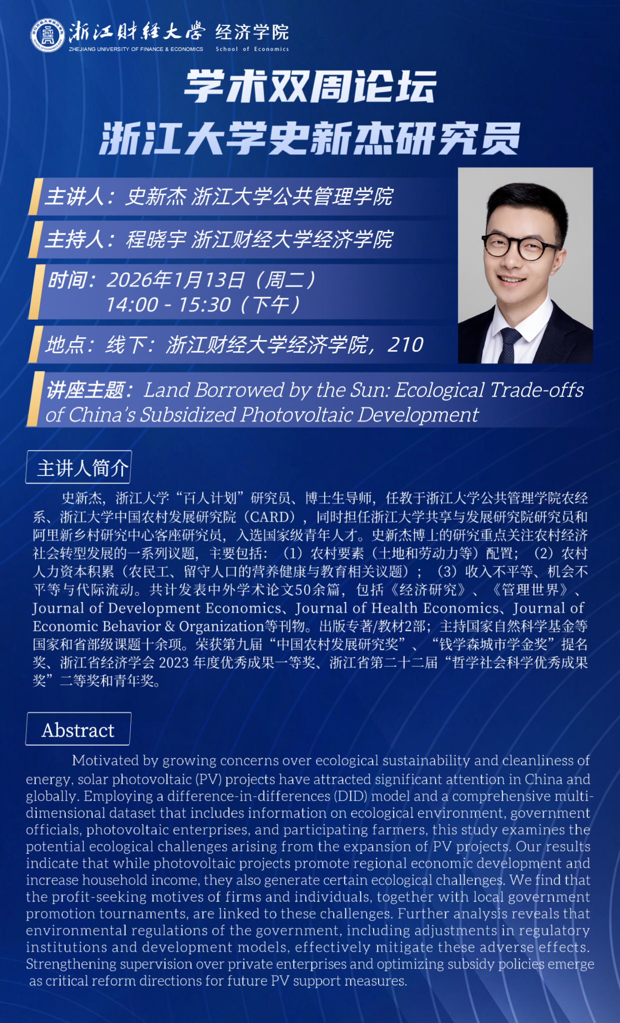 史新杰,浙江大学“百人计划”研究员、博士生导师,任教于浙江大学公共管理学院农经系、浙江大学中国农村发展研究院(CARD),同时担任浙江大学共享与发展研究院研究员和阿里新乡村研究中心客座研究员,入选国家级青年人才。史新杰博士的研究重点关注农村经济社会转型发展的一系列议题,主要包括:(1)农村要素(土地和劳动力等)配置;(2)农村人力资本积累(农民工、留守人口的营养健康与教育相关议题);(3)收入不平等、机会不平等与代际流动。共计发表中外学术论文50余篇,包括《经济研究》、《管理世界》、Journal of Development Economics、Journal of Health Economics、Journal of Economic Behavior & Organization等刊物。出版专著/教材2部;主持国家自然科学基金等国家和省部级课题十余项。荣获第九届“中国农村发展研究奖”、“钱学森城市学金奖”提名奖、浙江省经济学会 2023 年度优秀成果一等奖、浙江省第二十二届“哲学社会科学优秀成果奖”二等奖和青年奖。