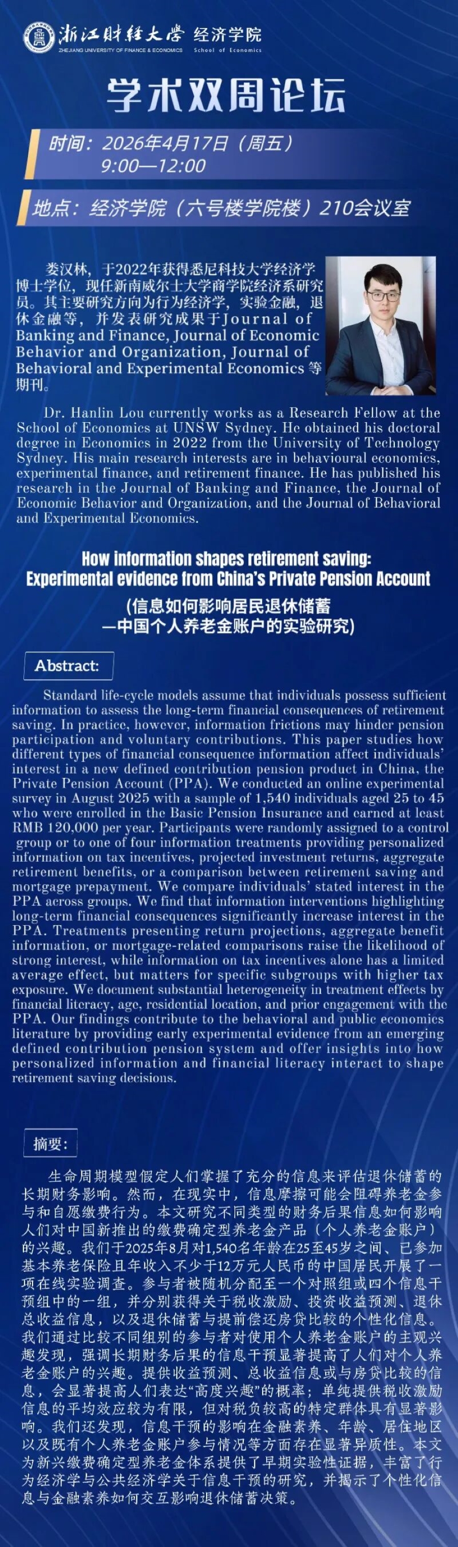 学术双周论坛——新南威尔士大学娄汉林研究员