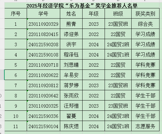 根据《浙江财经大学经济学院“乐为基金”奖学金评审办法》、《浙江财经大学经济学院“乐为基金”奖教金评选办法》,各教师、各班学生自愿申请,学院“乐为基金”评审委员会评审,“乐为基金”捐赠人认可,现将2025年“乐为基金”奖教金、奖学金推荐人公示如下: